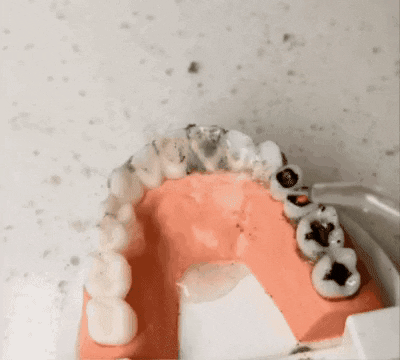 -Dirige el chorro entre los dientes y encías.